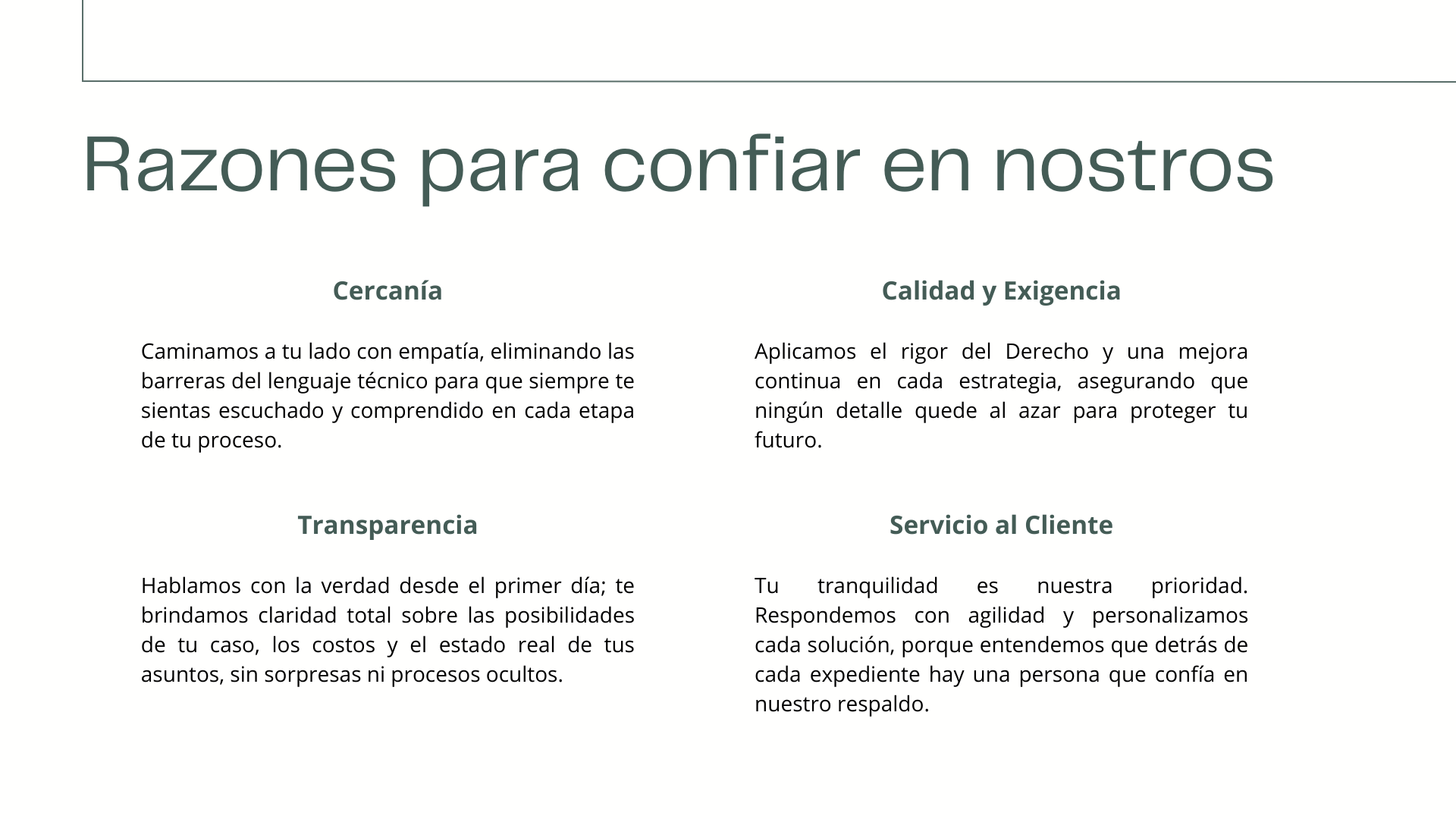 Cada persona y su situación son únicas. Considero cada caso no solo como un problema legal a resolver, sino como un desafío personal que me comprometo a enfrentar. Mi objetivo es establecer una conexión de confianza contigo, entendiendo a fondo tu situación para ofrecerte una solución legal a tu medida.